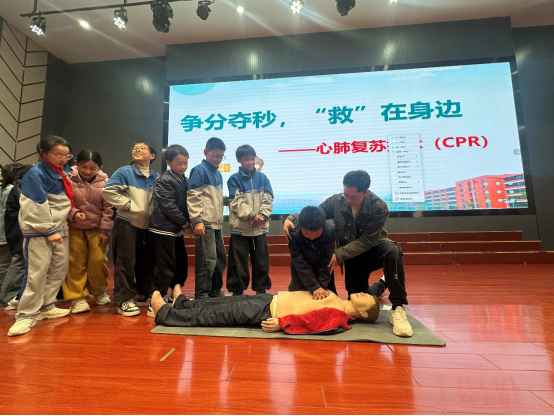 活动现场,宋宇娟老师采用“理论+实操”相结合的方式进行教学。大屏幕上“争分夺秒,‘救’在身边”的主题标语格外醒目,学生党员和志愿者们用通俗易懂的语言讲解了心肺复苏的适用场景与操作步骤,随后指导小学生在模拟人模型上练习胸外按压、开放气道等关键动作,并手把手纠正按压深度、频率以及人工呼吸的细节。现场学生们踊跃参与、认真观摩,在互动实践中掌握了急救核心技能。