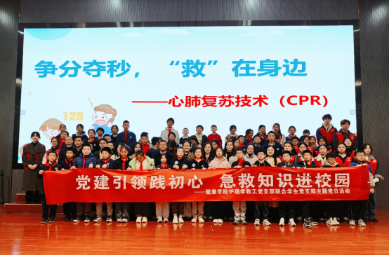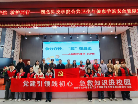活动最后,师生党员、志愿者及学生们合影留念,红色横幅上的“急救知识进校园”字样,彰显着此次活动“以专业践初心,以技能护安全”的初衷。后续学院还将持续开展此类科普活动,让急救知识覆盖更多群体,筑牢校园安全防线。