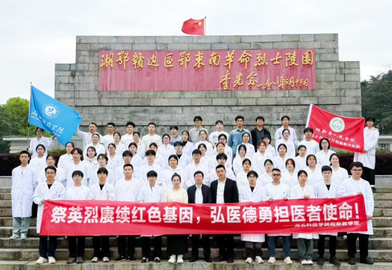 2026年4月2日,湖北科技学院阳新教学班全体师生前往湘鄂赣边区鄂东南革命烈士陵园,开展以“祭英烈赓续红色基因,弘医德勇担医学使命”为主题的清明祭扫活动,缅怀革命先烈,传承红色精神。